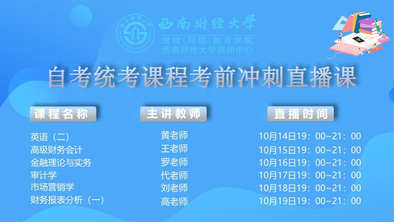 2024年10月的自考统考进入倒计时,为了帮助大家高效备考,学院将于2024年10月14日起开展本次统考课程考前冲刺直播课。课程及时间安排如下(线上直播地址另行通知):
