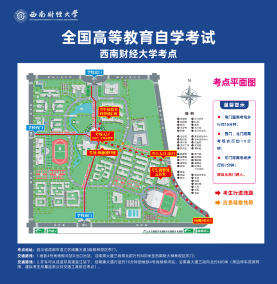 考生出示准考证经查验后由西南财大柳林校区东门进校,直行约600米到达考场。