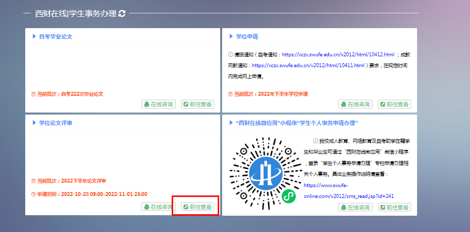 1.登录学位论文评审平台:西财在线—西财在线入口—学生事务办理—学位论文评审,点击“前往查看”—学位论文评审登录。(见下图)