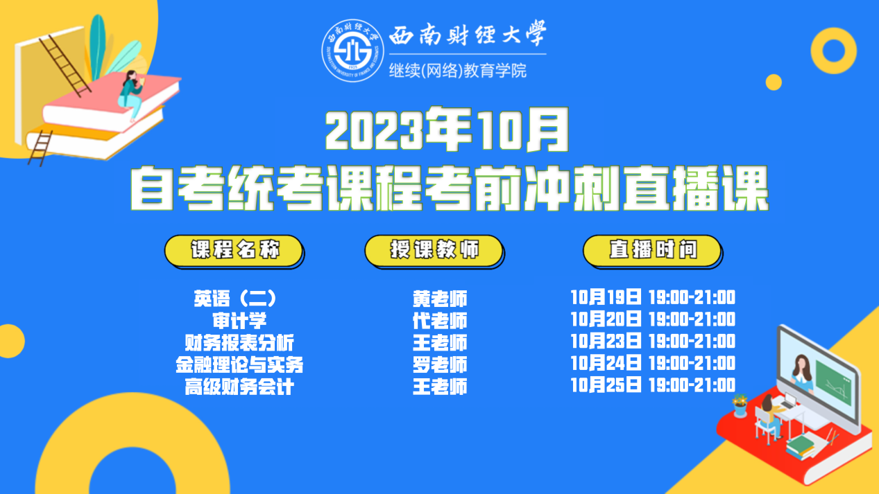为进一步提高我校自考学生备考复习效率,加强统考课程复习引导,我院初步定于2023年10月19-20日、23-25日19:00-21:00开展《英语(二)》等5门自考统考课程的考前冲刺直播课。课程及时间安排如下(线上直播地址另行通知):