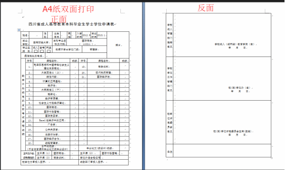 (二)完成网上信息申报后,学院将在2个工作日内进行初审,学生须及时关注,审核未通过的须按页面提示信息在申请时限内修改后再次提交,直至审核通过。审核通过的学生方可打印《基本信息登记表》和《四川省成人高等教育本科毕业生学士学位申请表》(后面简称学位申请表)。《学位申请表》为正反两面,须按打印设置要求使用A4纸双面打印如图: