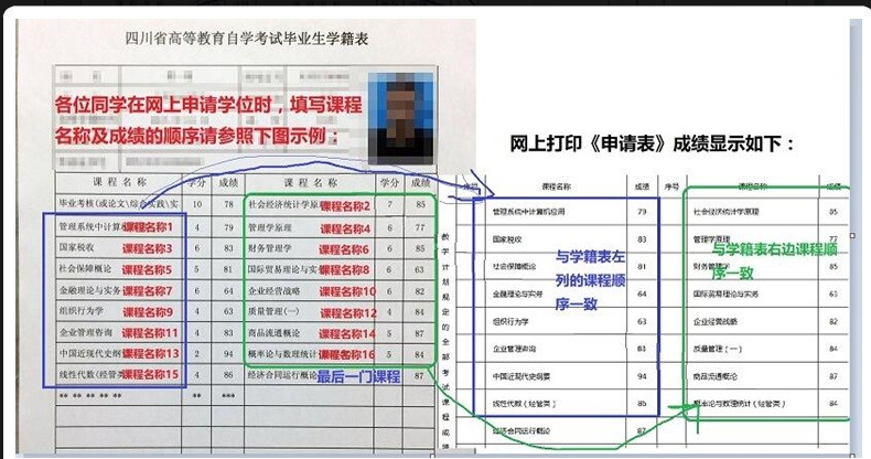 (五)自考毕业生网上申请时,需要在“其它信息填写”中自行填报课程名称及成绩,为保证最后网上打印的《学位申请表》中课程顺序符合要求,请务必按下图所示顺序填报: