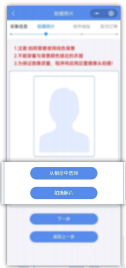 (1)点击去采集按钮后进入照片拍摄页面,图像采集分为“从相册中选择”和“拍摄照片”,建议采用“拍摄照片”。