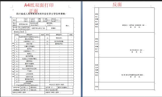 (二)完成网上信息申报后,学院将在2个工作日内进行初审,学生须及时关注,初审未通过的须按页面提示信息在申请时限内修改,直至审核通过。初审通过的学生方可打印《基本信息登记表》、《四川省成人高等教育本科毕业生学士学位申请表》(后面简称学位申请表)。《学位申请表》为正反两面,须按打印设置要求使用A4纸双面打印如图: