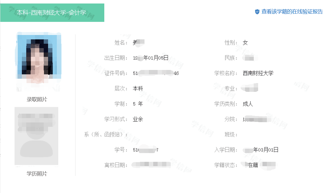 2.进入“学信档案”选择“高等教育信息”,根据显示的个人学籍注册信息逐一认真核对,包括姓名、身份证号码、就读院校名称、专业名称、层次、录取照片、学籍状态:“在籍(注册学籍)等”,确认注册信息无误后退出该系统即可。如发现注册信息有误或存在疑问,须及时向所在站点老师反映或通过学院学习支持服务QQ: 800013499咨询。学生本人还可通过学信网平台申请“学籍在线验证报告”。