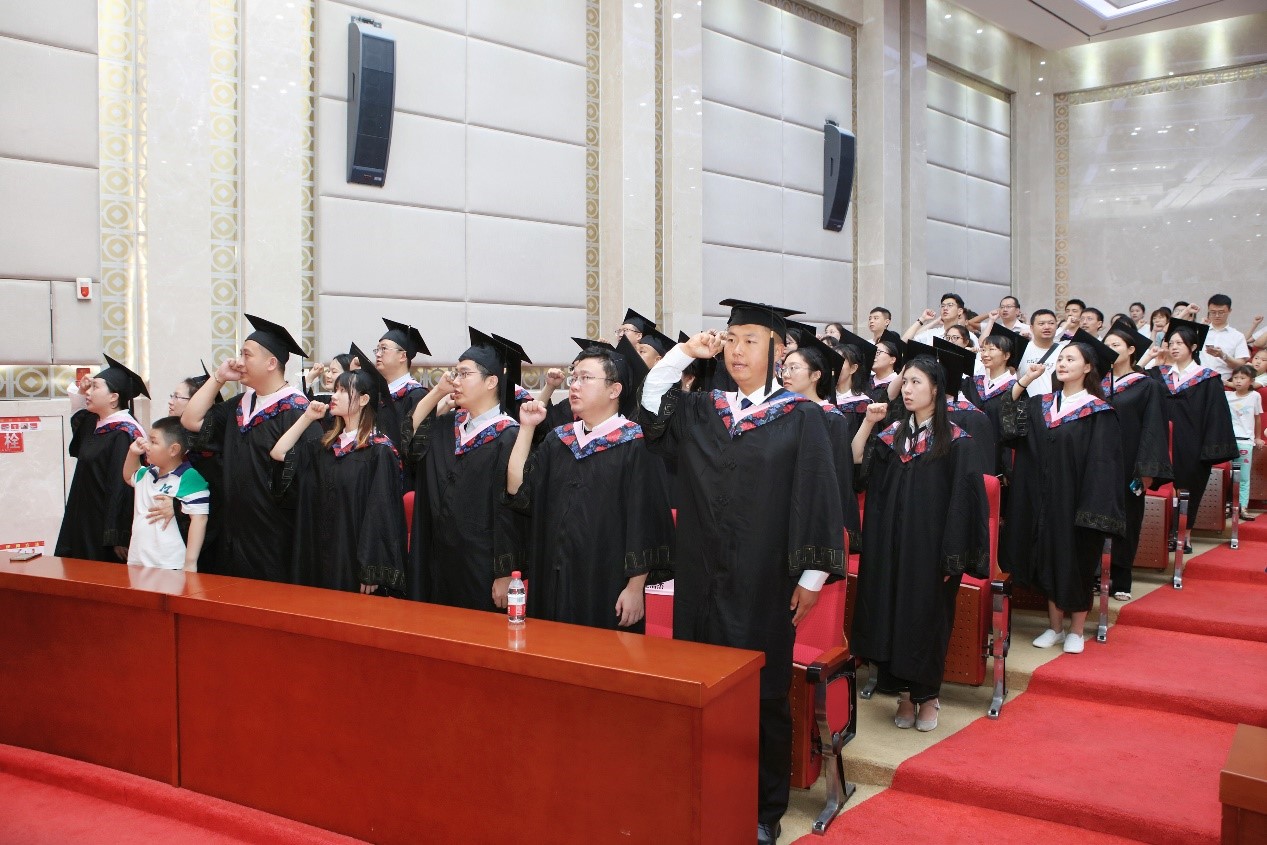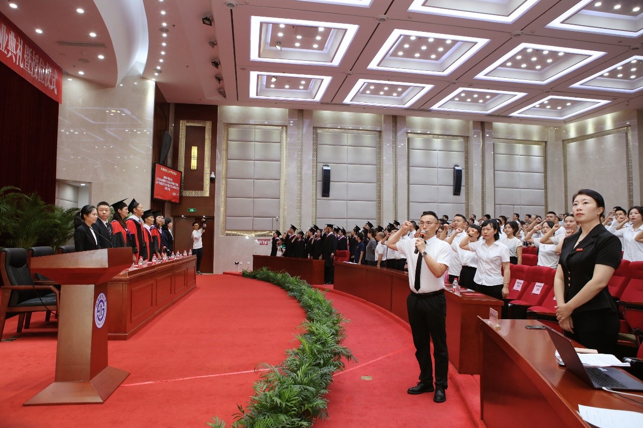 全场毕业生高举右拳齐声宣誓:将不忘初心、捍卫真理,不惧风雨、勇挑重担,以国家利益为重,让青春在祖国和人民最需要的地方绽放,为中华民族伟大复兴和人类文明共同进步贡献力量。