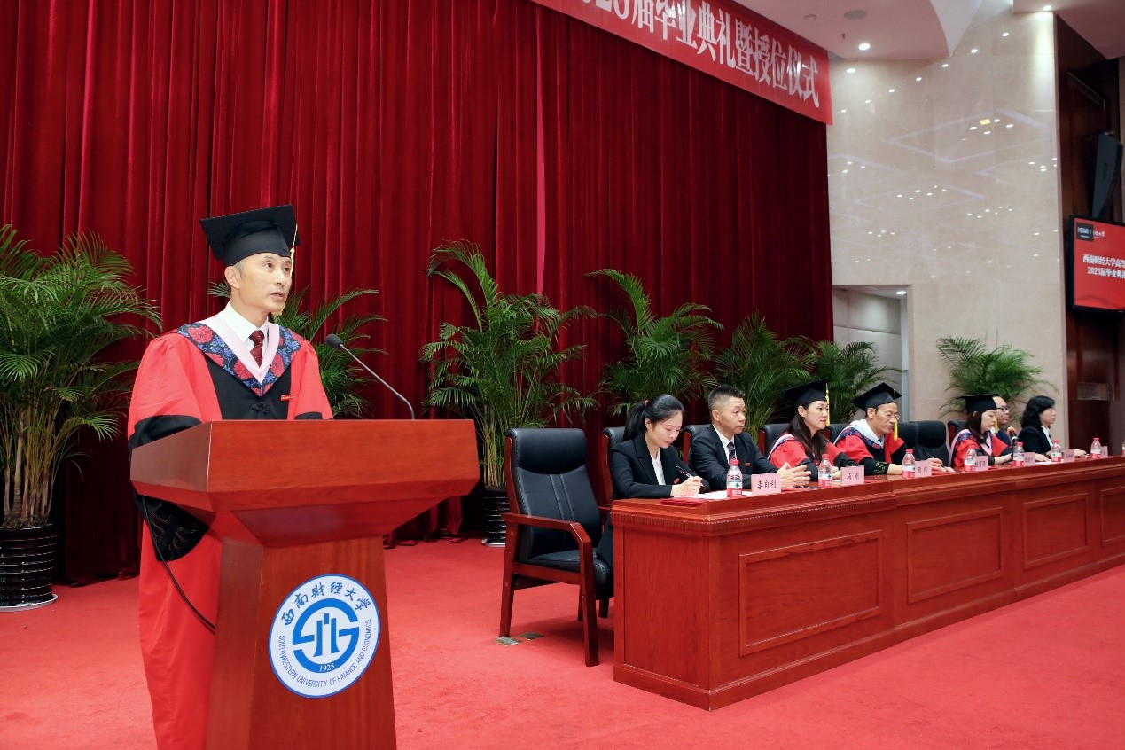 桂富强副校长以《大鹏展翅志凌云 不负时代担使命》为题向2023届毕业生送上临别寄语。他首先向圆满完成学习的同学们致以最热烈的祝贺,向关心支持同学成长的师长和家人致以最诚挚的感谢。他深情寄语毕业生,要牢记使命,践行“大气为人、大智谋事、大爱行天下”的西财青年品格,增强干事创业的底气,为实现民族复兴而奋斗;要自强不息,在人生的舞台上发挥自己最大的价值,成就最好的自己,为实现人生价值而奋斗;要勇于探索,不断突破自我,敢为人先,为融通未来而奋斗;要乐业感恩,传承家庭美德,勇挑重担责任,为家庭幸福而奋斗。希望2023届毕业生在新征程的大道上,心系天下苍生,勇敢的做一个奋斗者,追梦人,奔向更加光明的未来!