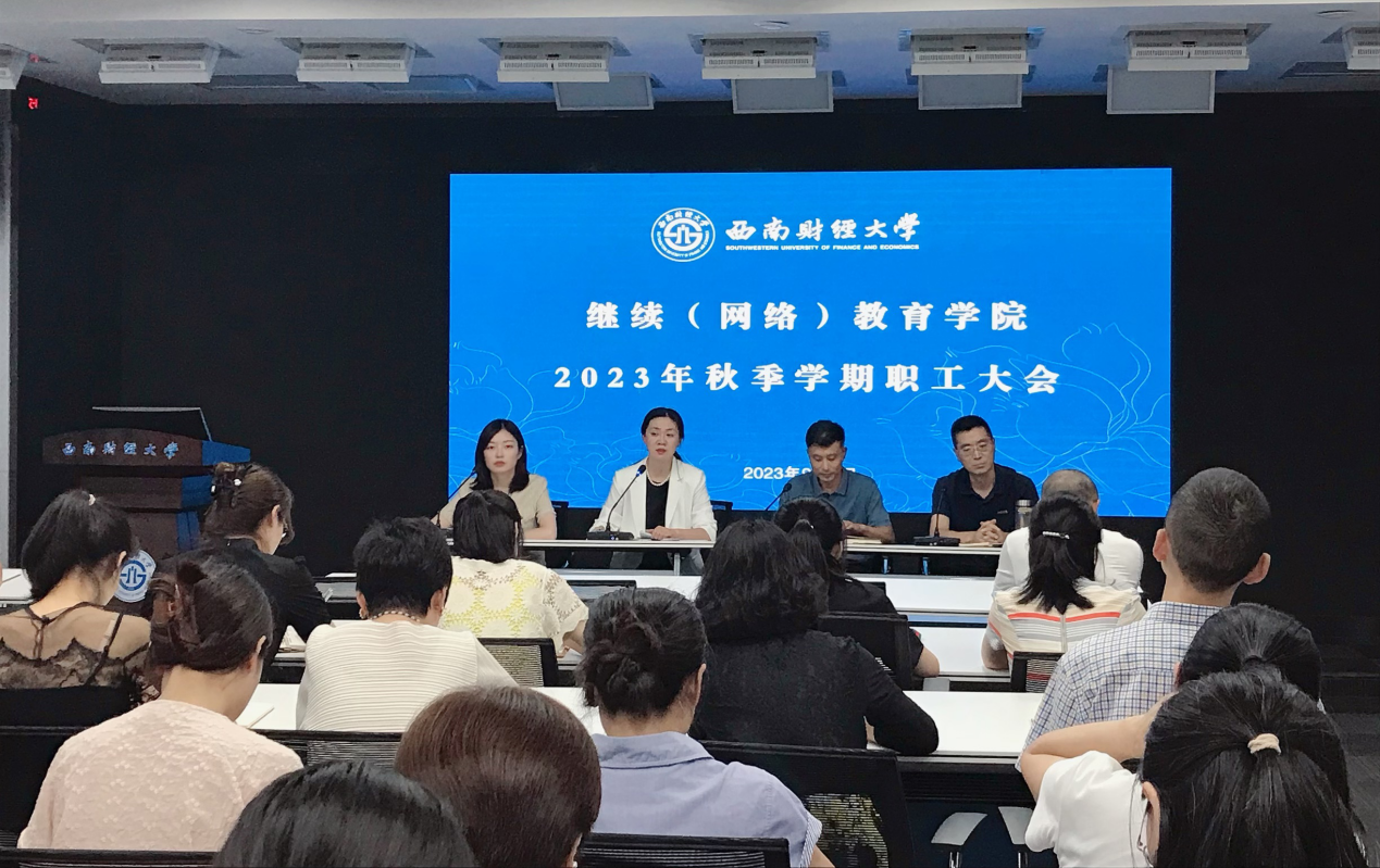 9月7日下午,继续(网络)教育学院秋季学期职工大会在计算机楼未来教室举行。会议传达了学校2023年秋季学期中层干部学习会精神并安排部署学院秋季学期工作。学院院长曾朝夕主持会议,全体职工参加大会。