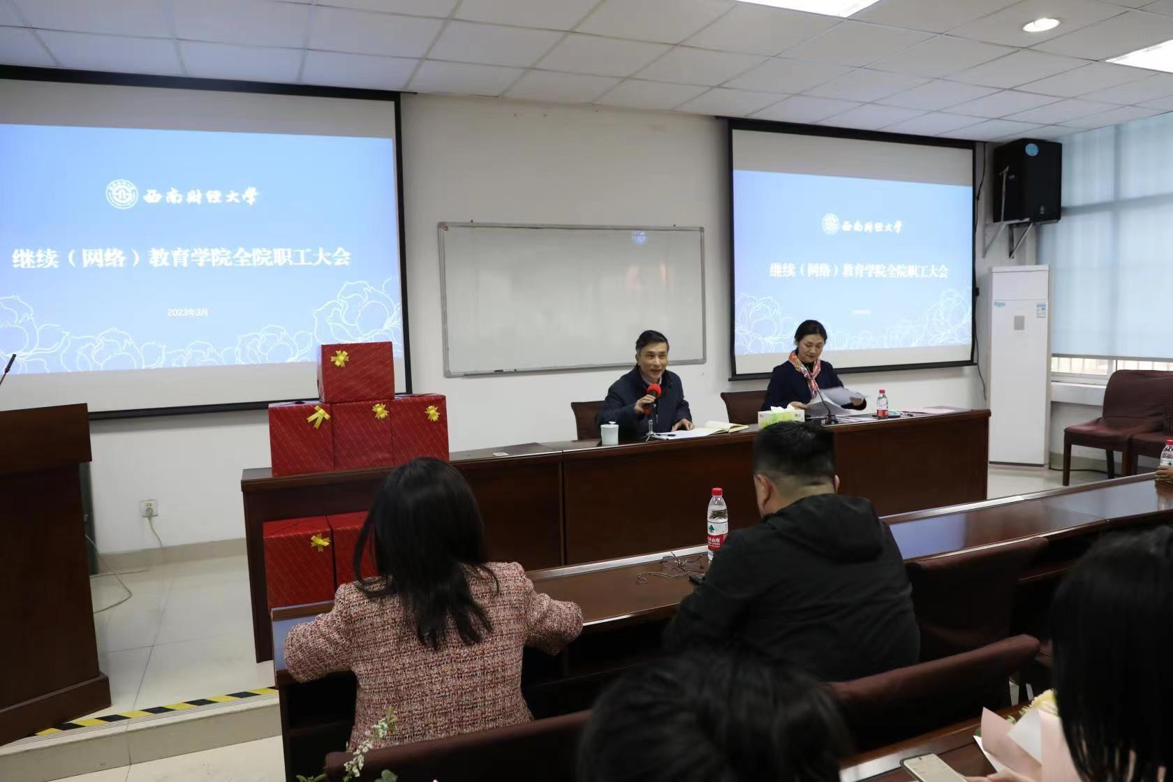 曾院长回顾总结了春季开学期以来开展的各项工作,深刻分析了当前继续教育发展趋势和学院发展形势。他强调需要增强忧患意识,提振干事创业的精气神;明确发展目标,走好转型高质量发展的步伐;强化协同意识,增强转型高质量发展合力;守纪律、讲规矩,为转型高质量发展提供坚强保障。他要求,2023年学院要把握继续教育改革发展新机遇新挑战,全院职工上下齐心、愿意干事创业、敢于克服困难,高质量抓好年度重点工作,奋力书写中国式现代化教育西财继续教育新篇章。