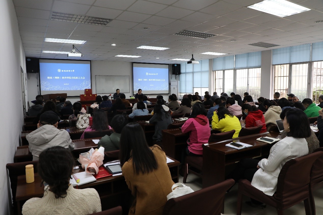3月7日下午,继续(网络)教育学院在计算机楼106视频会议室召开全院职工大会,传达学校中层干部学习贯彻党的二十大精神读书班的精神、安排部署和提出春季学期重点工作和各项要求。学院院长曾朝夕主持会议,全体教职员工参加。