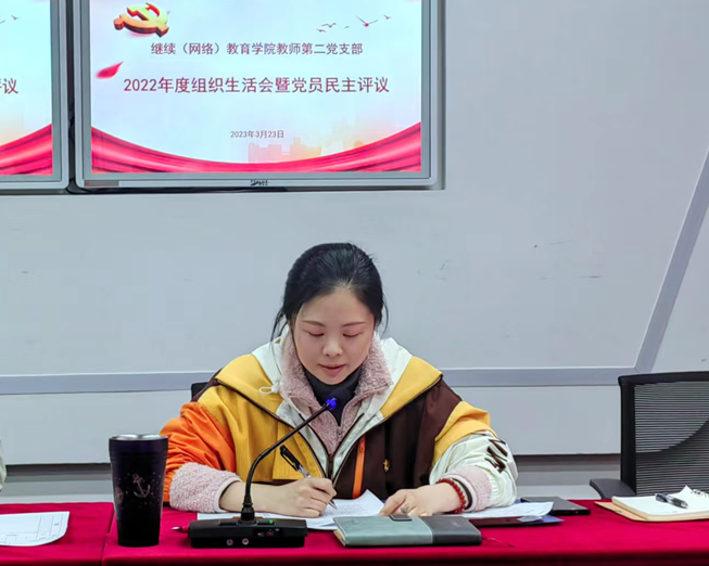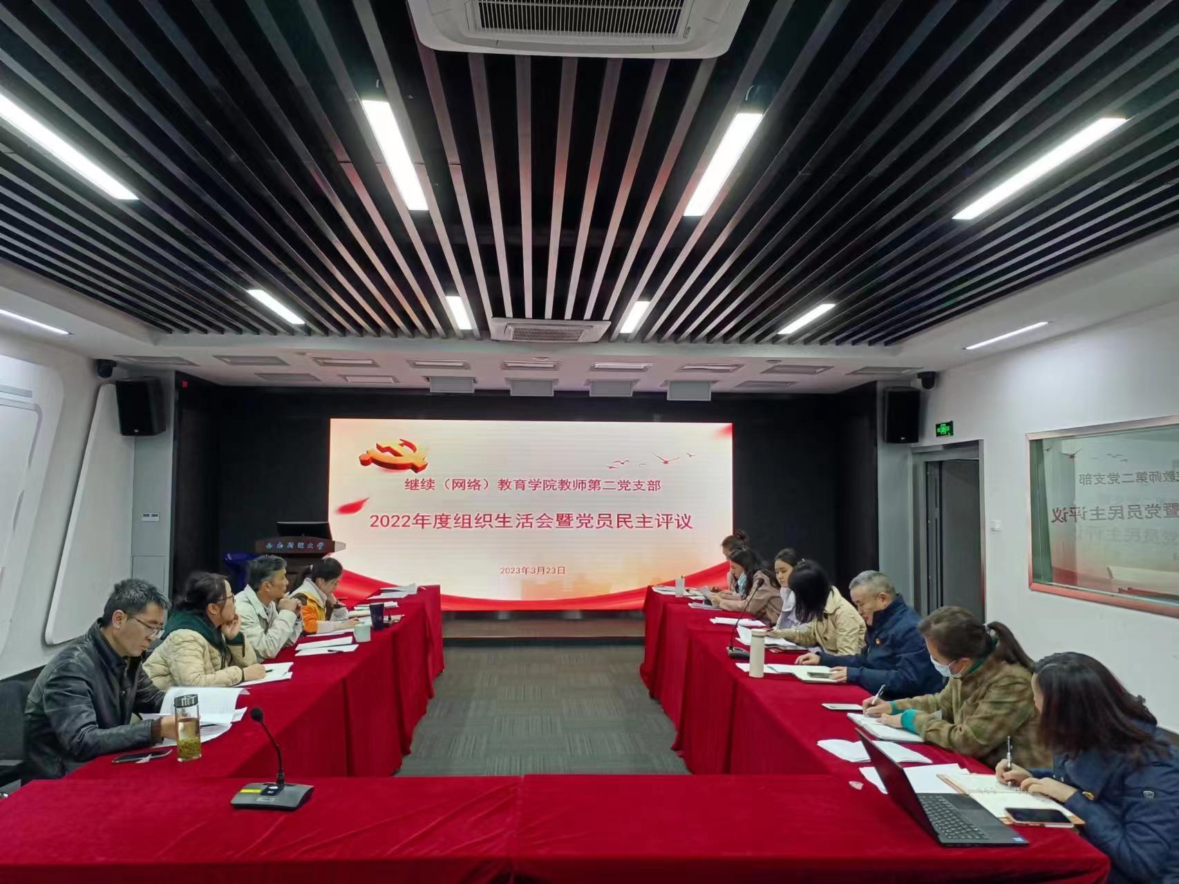3月23日,继续(网络)教育学院教师第二党支部在光华校区未来教室召开2022年度组织生活会暨民主评议党员大会。会议由党支部书记李自利同志主持,党总支委员曾朝夕、李杰同志以普通党员身份参加本次会议。