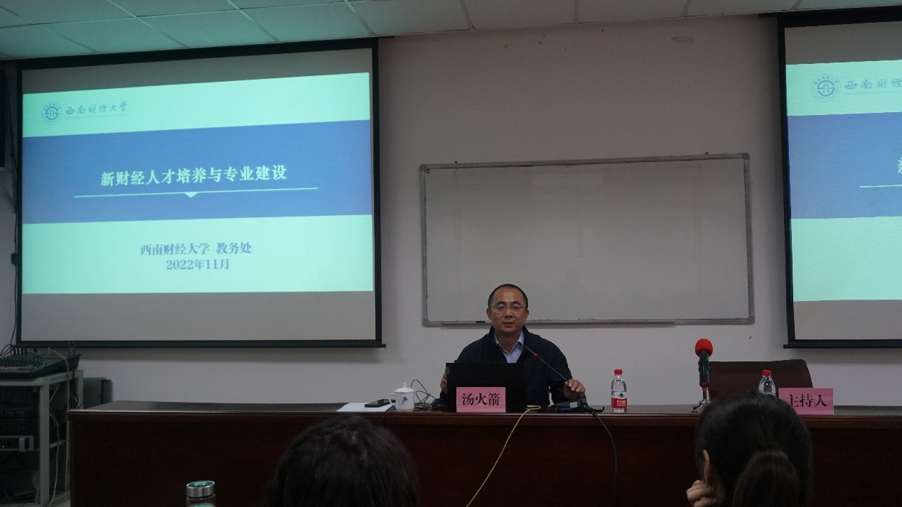 为深入学习贯彻党的二十大精神,推动党的二十大对继续教育工作的战略部署贯彻落实到学院事业发展各方面全过程,切实把学习成效转化为加快推进学院转型高质量发展的强大动力,11月8日下午,永利3044集团官网教务处长汤火箭教授应邀来我院讲授题为“新财经人才培养与专业建设”的专题讲座,讲座由院长曾朝夕教授主持,学院领导班子成员和全体教职工参加。