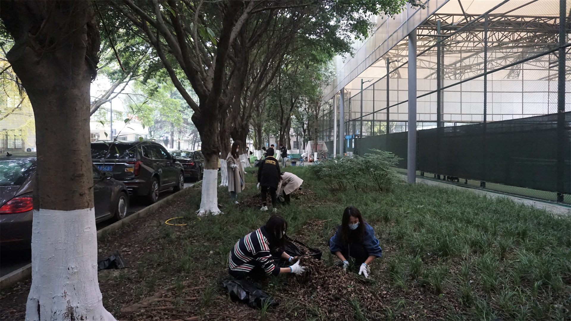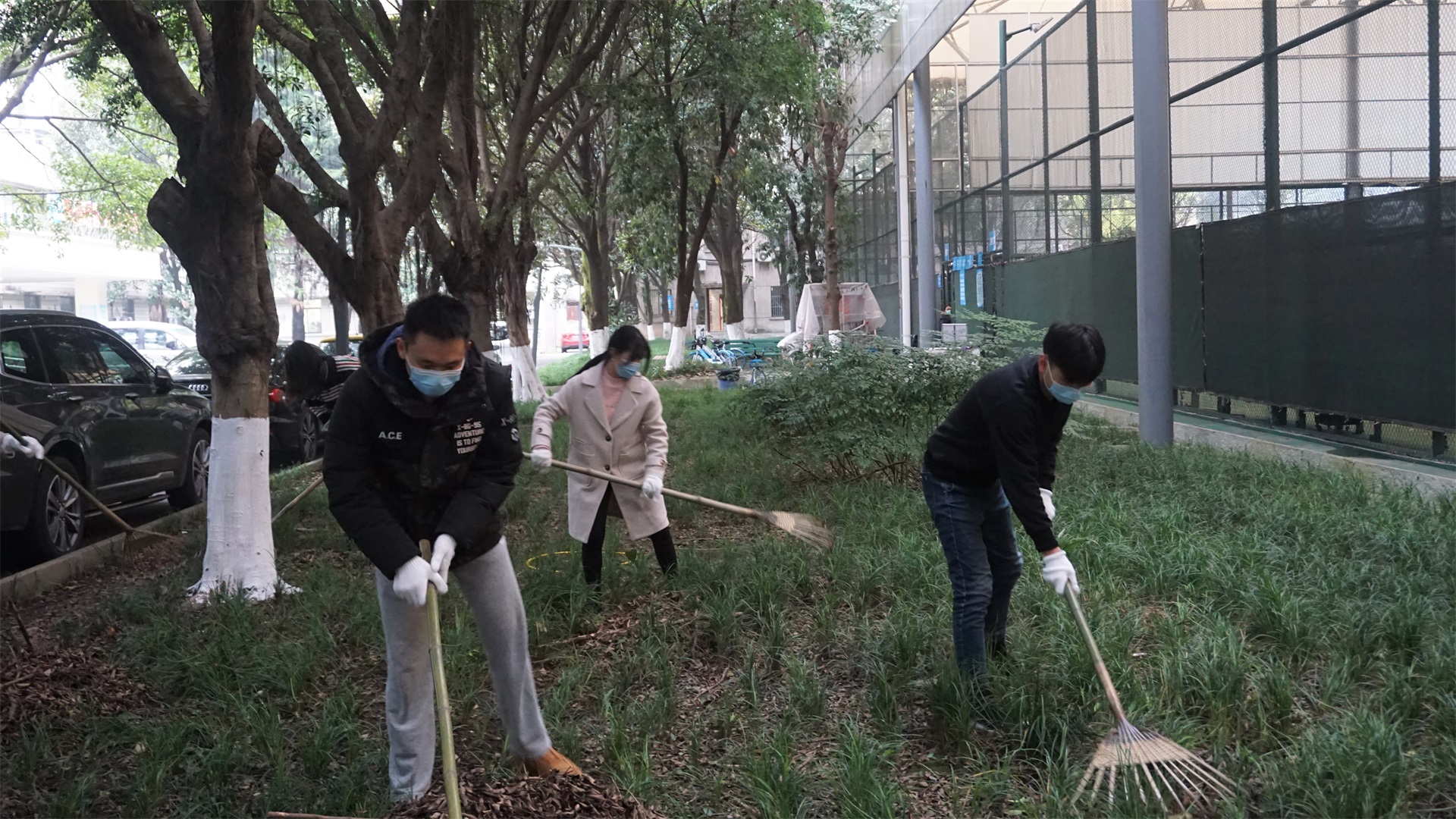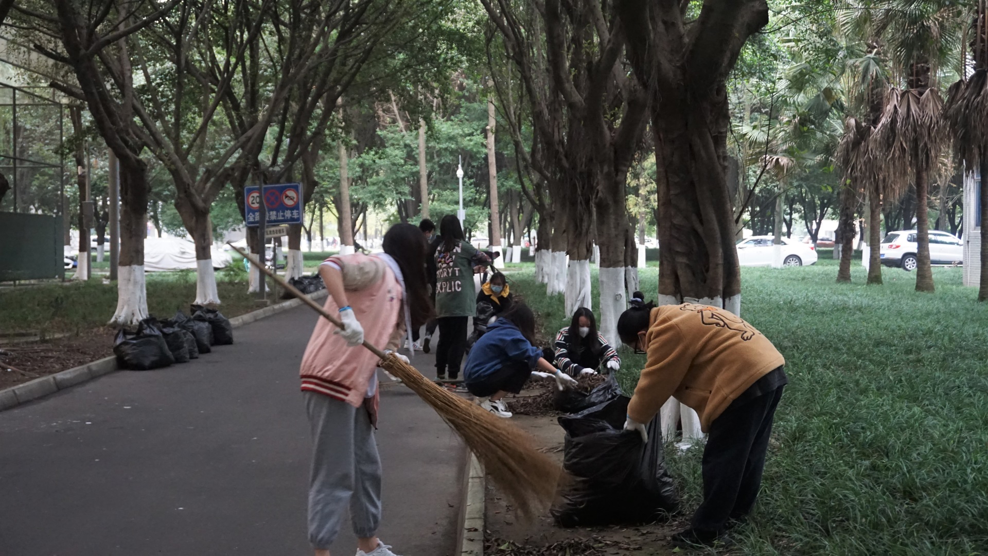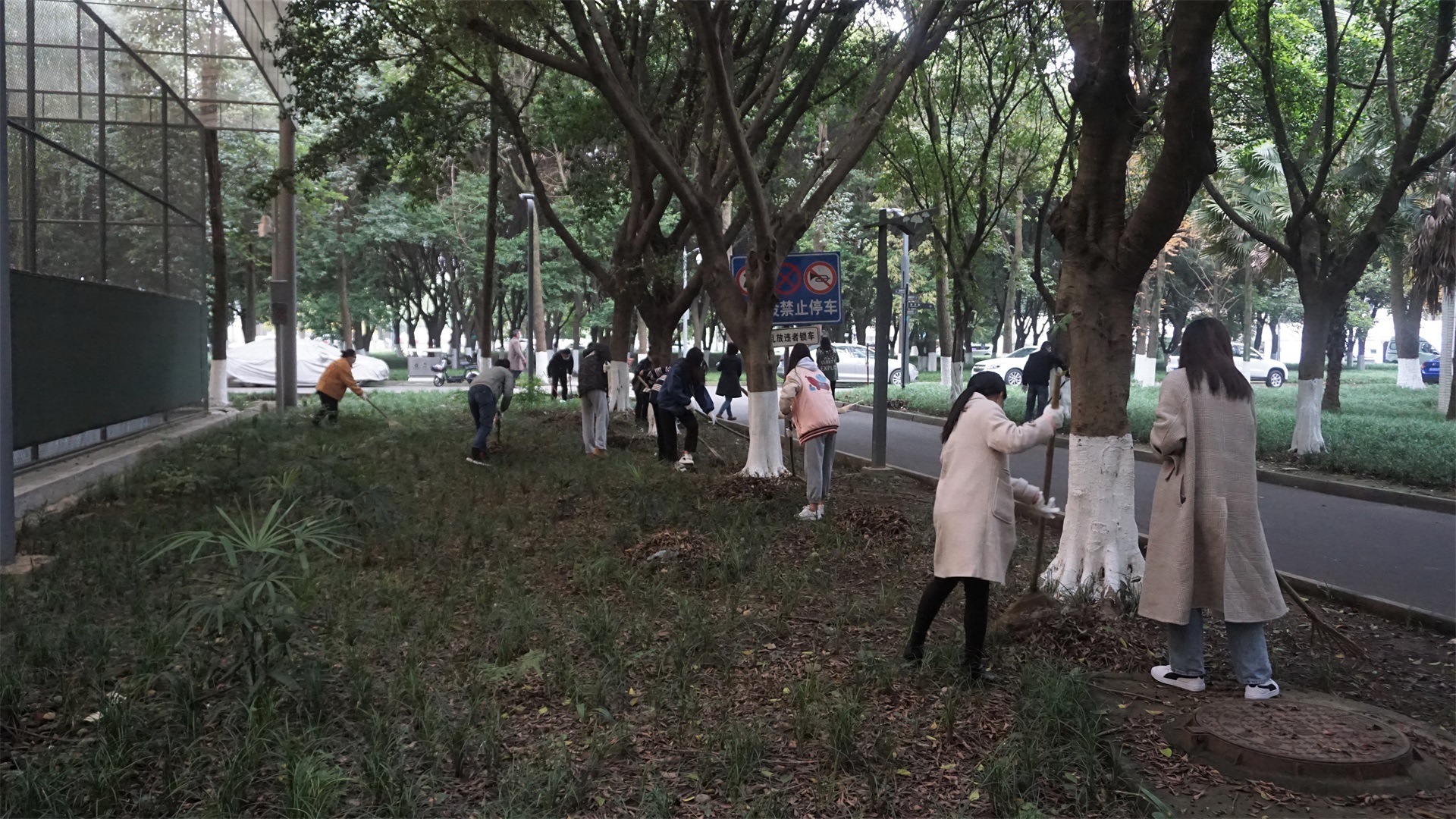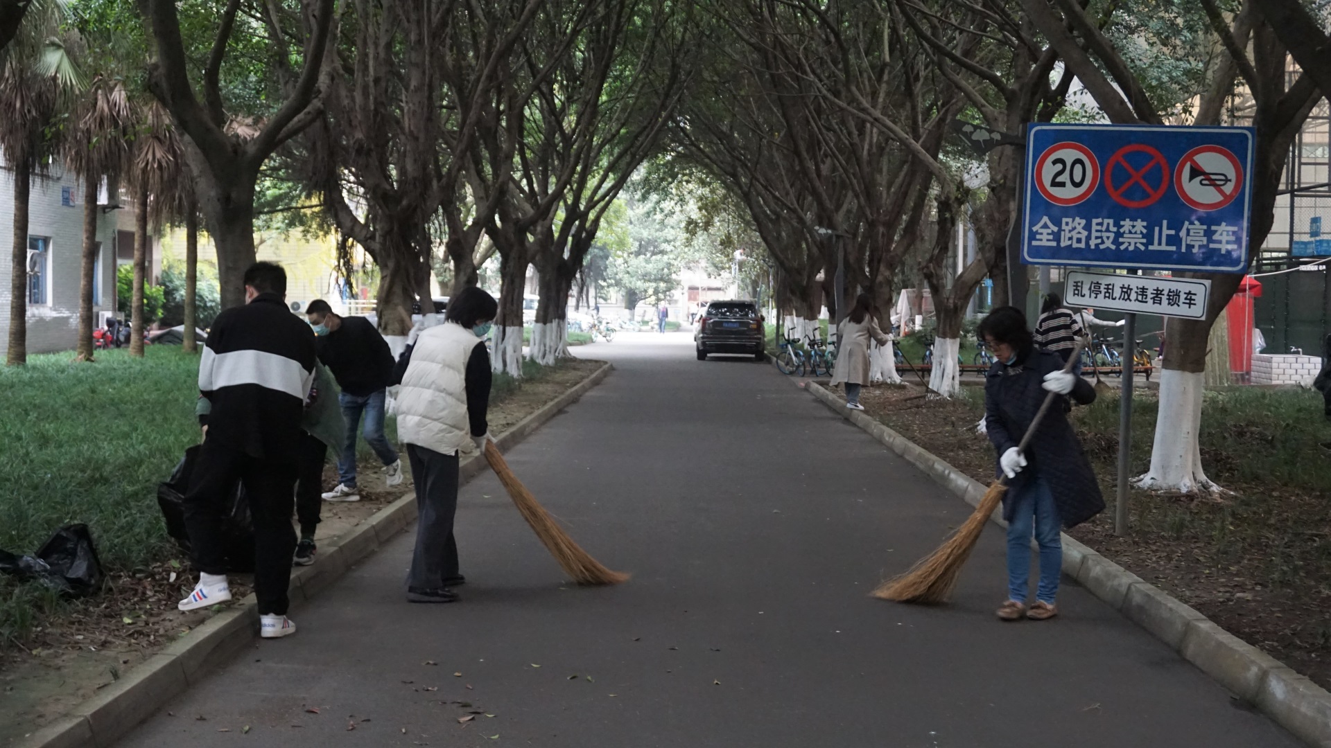 下午3点20分,师生们提前来到划定的学习生活环境分片包干责任区域集合。大家领取了后勤服务总公司工作人员提前准备好的打扫卫生所需的扫帚、竹耙、手套、垃圾袋等工具后,迅速投入到热火朝天的劳动之中。师生们分工协作,不怕累,不怕脏,积极打扫枯叶并将枯枝落叶集堆装袋。一个小时后,风雨球场和出版社之间的三块绿化带被清扫得干干净净。