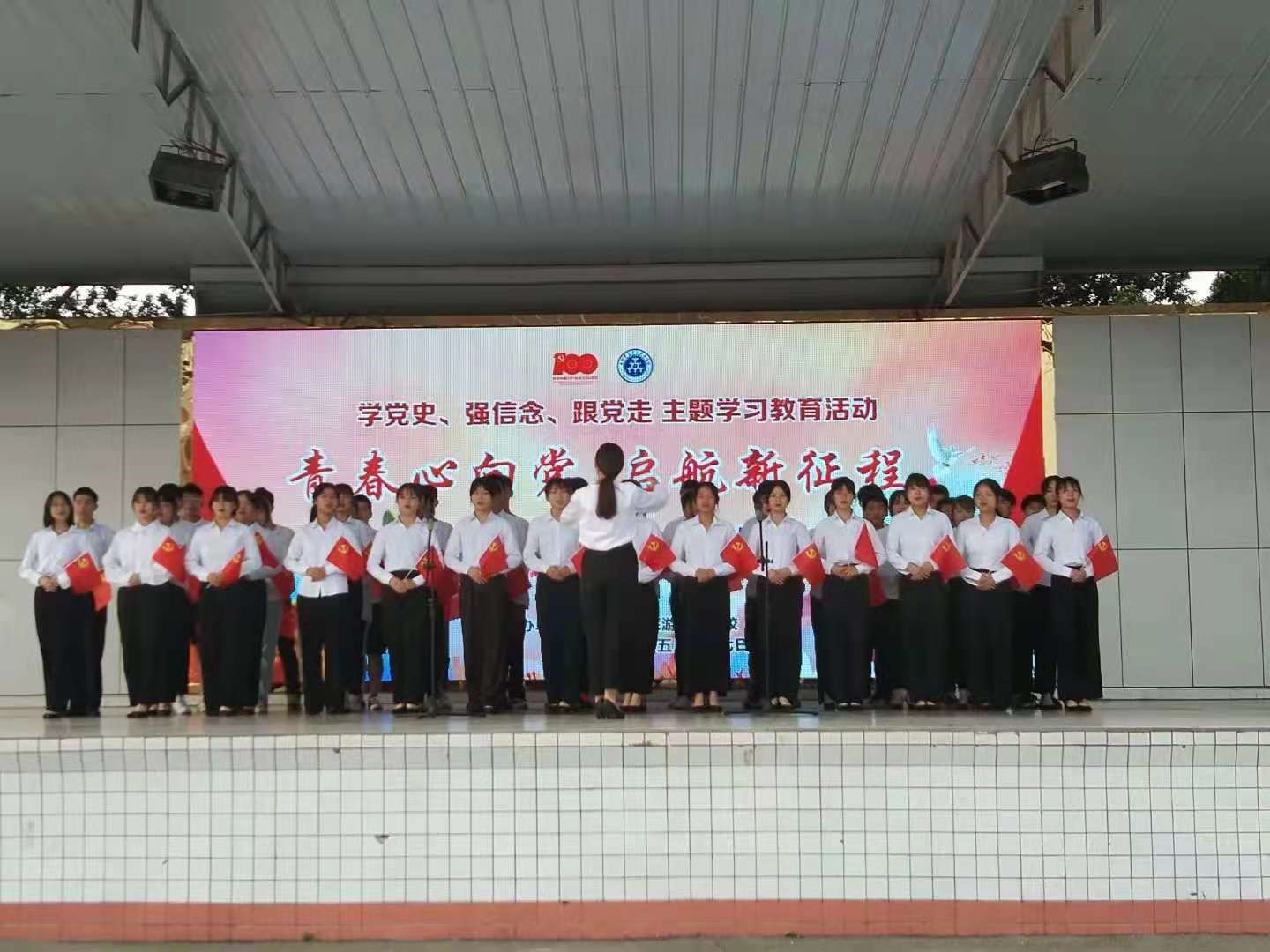 配合学校开展庆祝中国共产党成立100周年主题活动,大力宣传与组织开展“颂歌献给党”主题活动和“百年大党风华正茂”书画摄影等师生原创作品大赛,动员学生参加,唱红歌,讲述党史故事,传承红色基因。