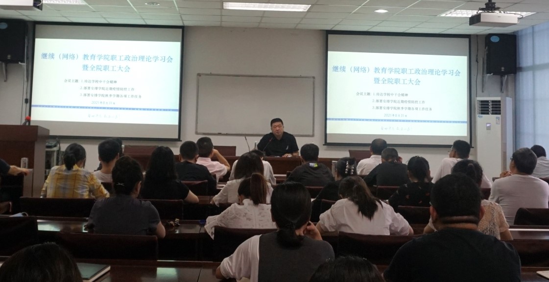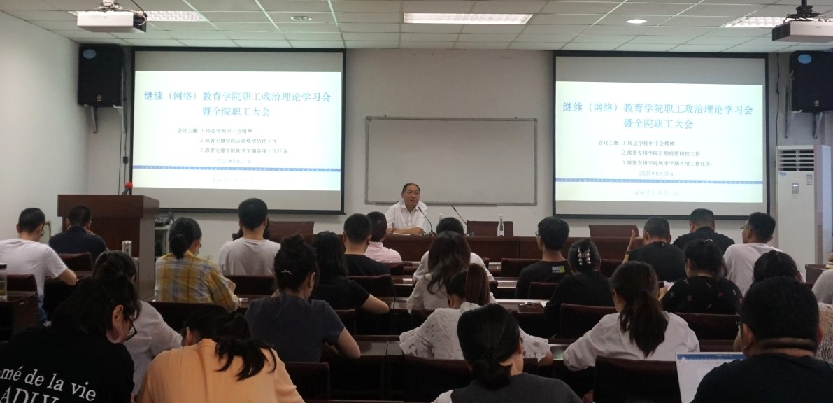 8月31日下午,继续(网络)教育学院在计算机楼106视频会议室召开全院职工政治理论学习会暨全院职工大会,传达学校中干会精神、部署安排学院近期疫情防控工作以及学院秋季学期各项工作任务。党总支书记殷晓明主持会议。