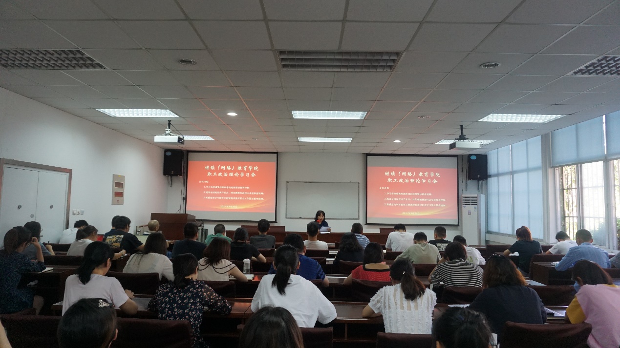 9月28日下午,继续(网络)教育学院在计算机楼106视频会议室召开全院职工政治理论学习会,结合学校“师德师风建设月”活动方案,深入开展警示教育。会议由党总支副书记、纪检工作小组组长郑斌主持,全院职工参加学习。