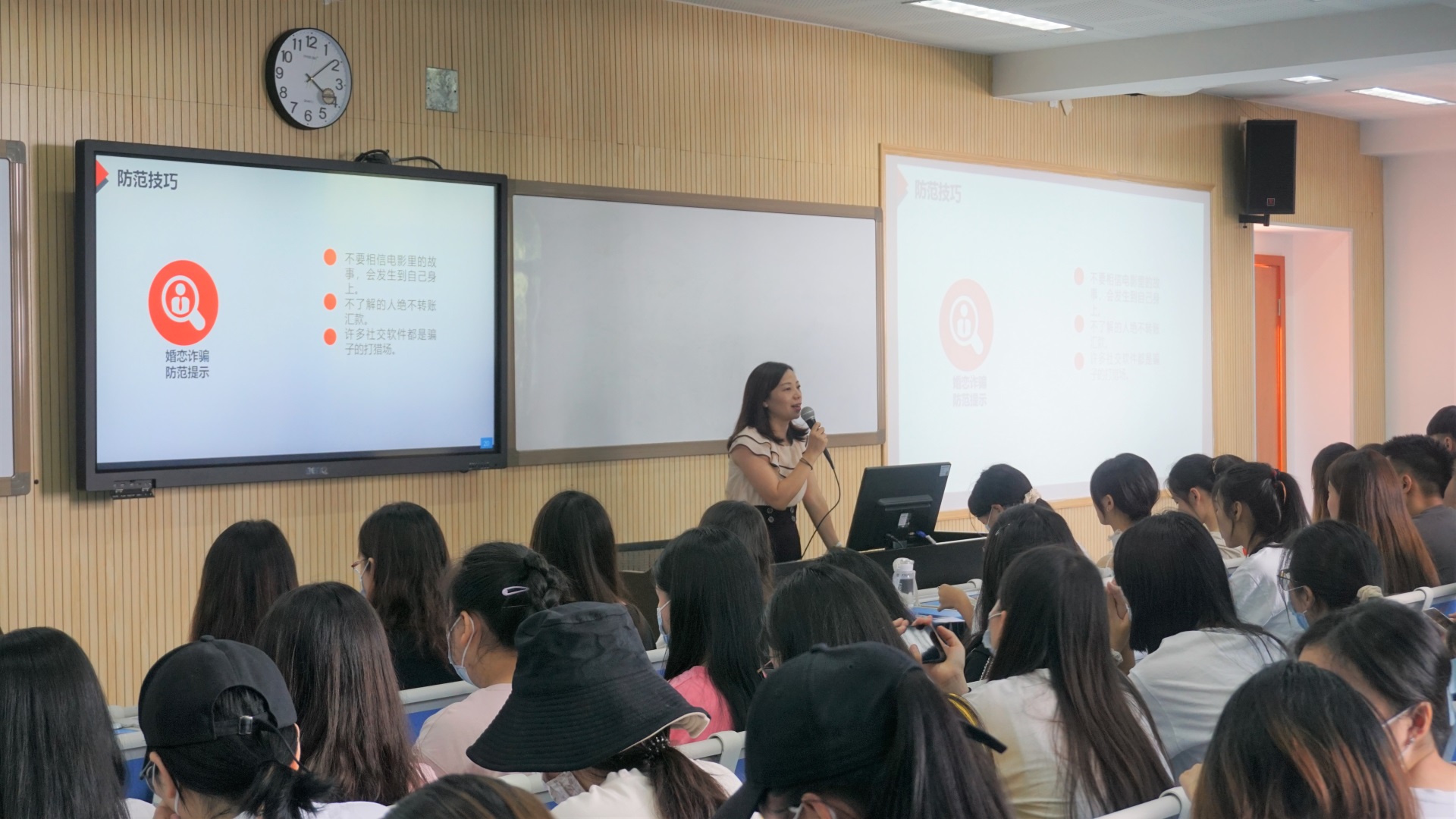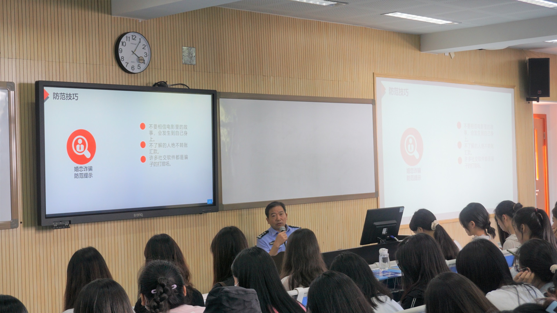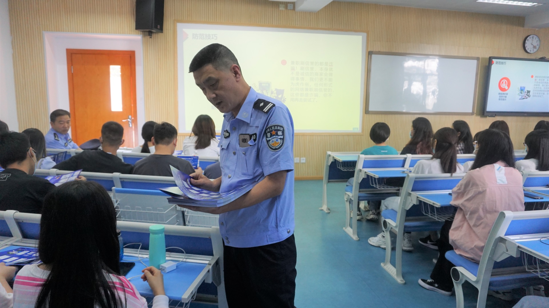 活动中,郭所长结合多起真实的电信诈骗案例,详细讲解了什么是电信诈骗、电信诈骗的常见形式、如何防范电信诈骗、上当受骗后的补救措施等四个方面的内容。电信诈骗具有蔓延性较大,发展迅速、诈骗手段翻新速度快、诈骗成员集团化,反侦查能力强、跨国跨境犯罪突出等特点,侦破难度大。公安机关破获的诈骗案件都有一个共同的规律:无论诈骗分子如何花言巧语,诈骗手法如何翻新,最后都要落在一个点上,就是转账。郭所长提醒广大师生,千万不要轻信来历不明的电话、短信,不要轻易透露自己的身份和银行卡的信息,更不能轻易转账,如果遇见可疑情况,要及时向公安机关、长辈、朋友等询问核实,避免上当受骗,确保财产安全。光华派出所民警向现场师生发放了防范电信诈骗宣传资料。