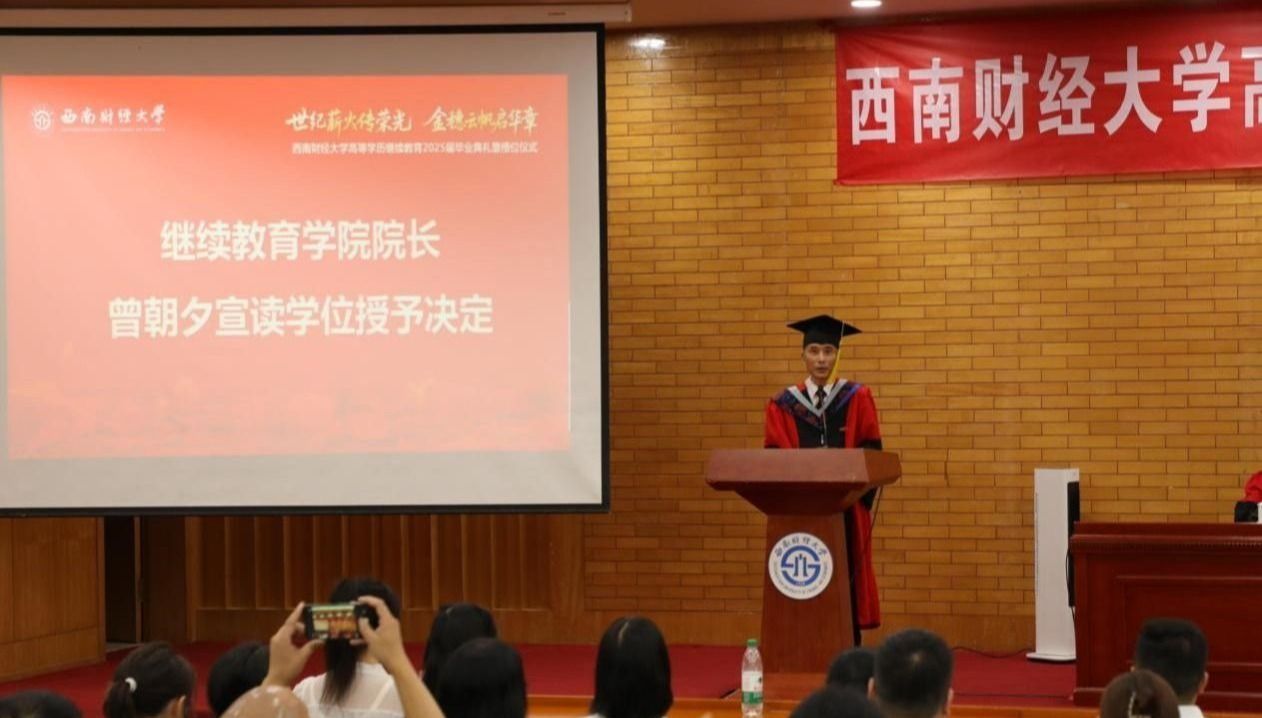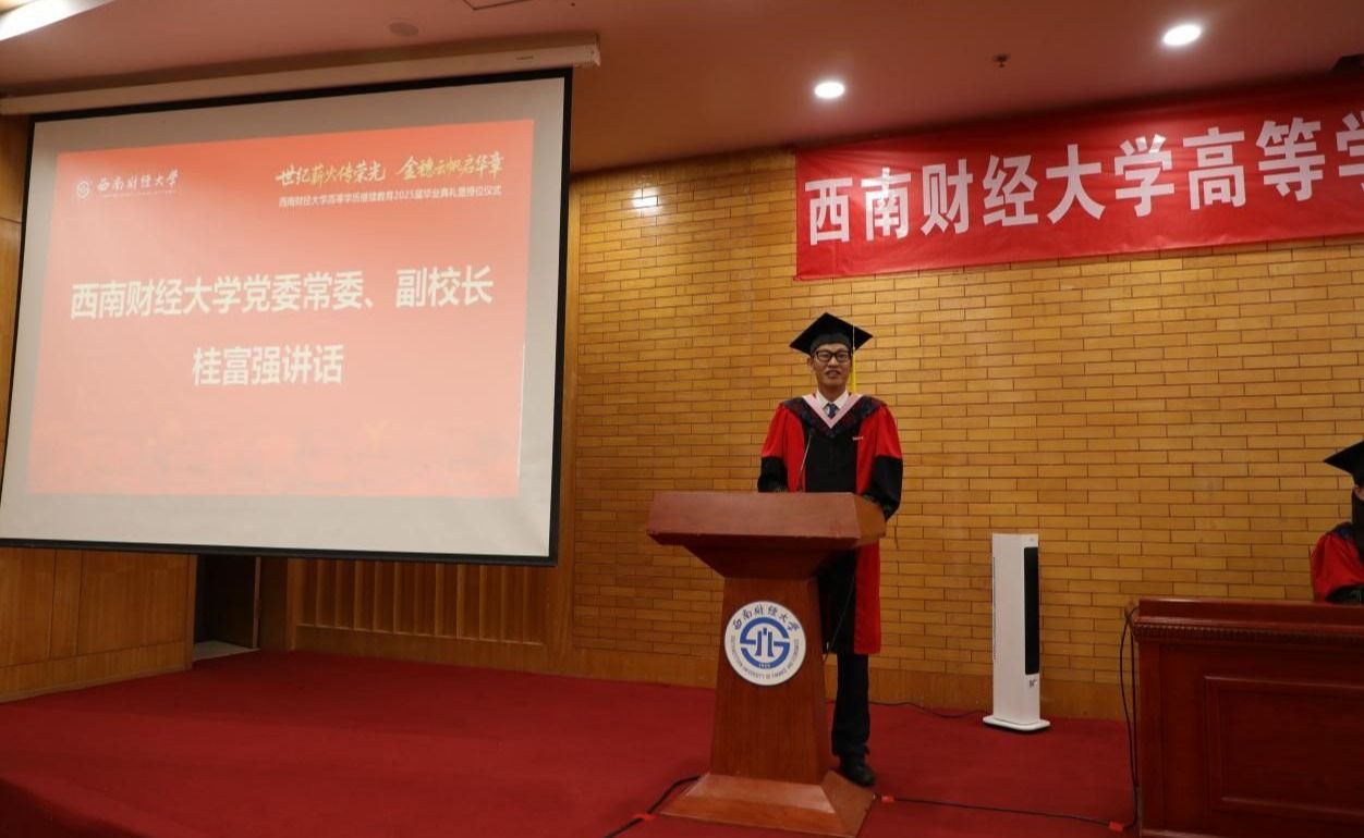 桂富强副校长以《世纪薪火传荣光 金穗云帆启华章》为题,深情寄语2025届毕业生。他向顺利完成学业的同学们致以最热烈的祝贺,向关心支持同学成长的师长和家人致以最诚挚的感谢,希望同学们在平凡中创非凡,将个人的成长轨迹、家庭的幸福愿景,与国家繁荣昌盛的宏伟蓝图紧密交织,同频共振;重德行,善学习,主动拥抱变革,持续汲取新知,拓展认知边界,锤炼批判思维、创新能力和解决复杂问题的核心素养;做西财新百年征程的同路人,接过百年薪火,传承“大气为人、大智谋事、大爱行天下”的西财青年品格,以蓬勃的青春之力,为中华民族伟大复兴的中国梦添彩增色。他鼓励同学们在新征程中,初心如炬、风雨不惧,闪烁属于自己的星光,像骏马一样纵横驰骋。