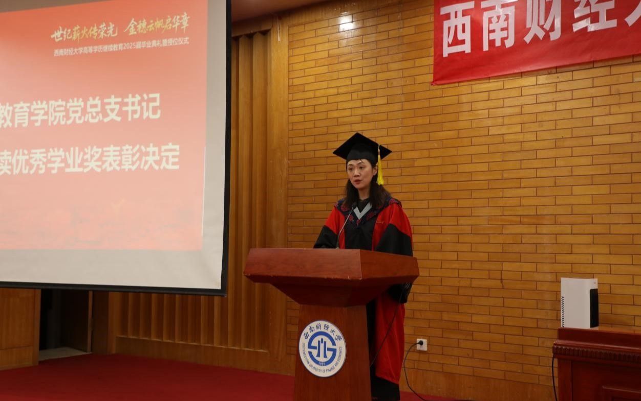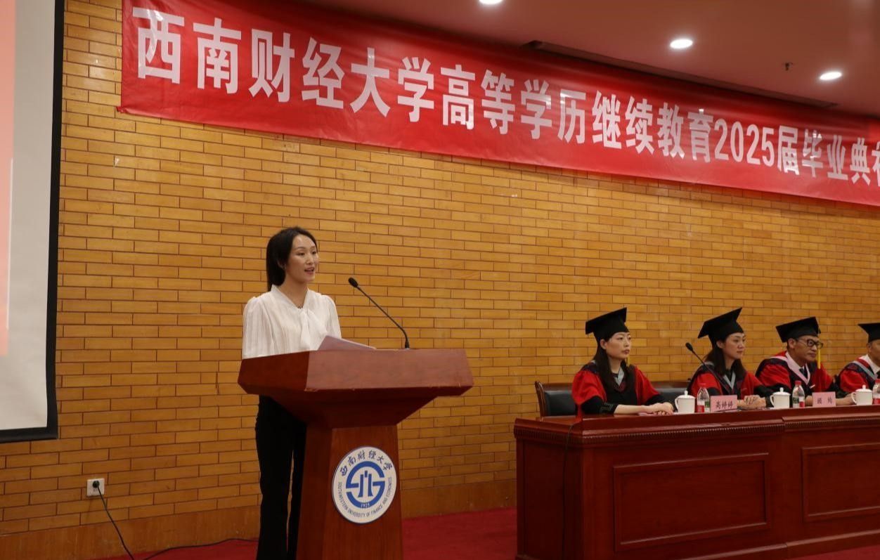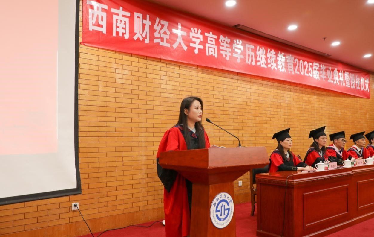 毕业生代表陈欣月分享了追梦奋斗的西财时光,表达了对母校和老师的感激之情,表示将始终牢记“严谨、勤俭、求实、开拓”的校训,继续践行“经世济民、孜孜以求”的西财精神,用所学所长服务社会,用实际行动诠释西财人的初心与担当。