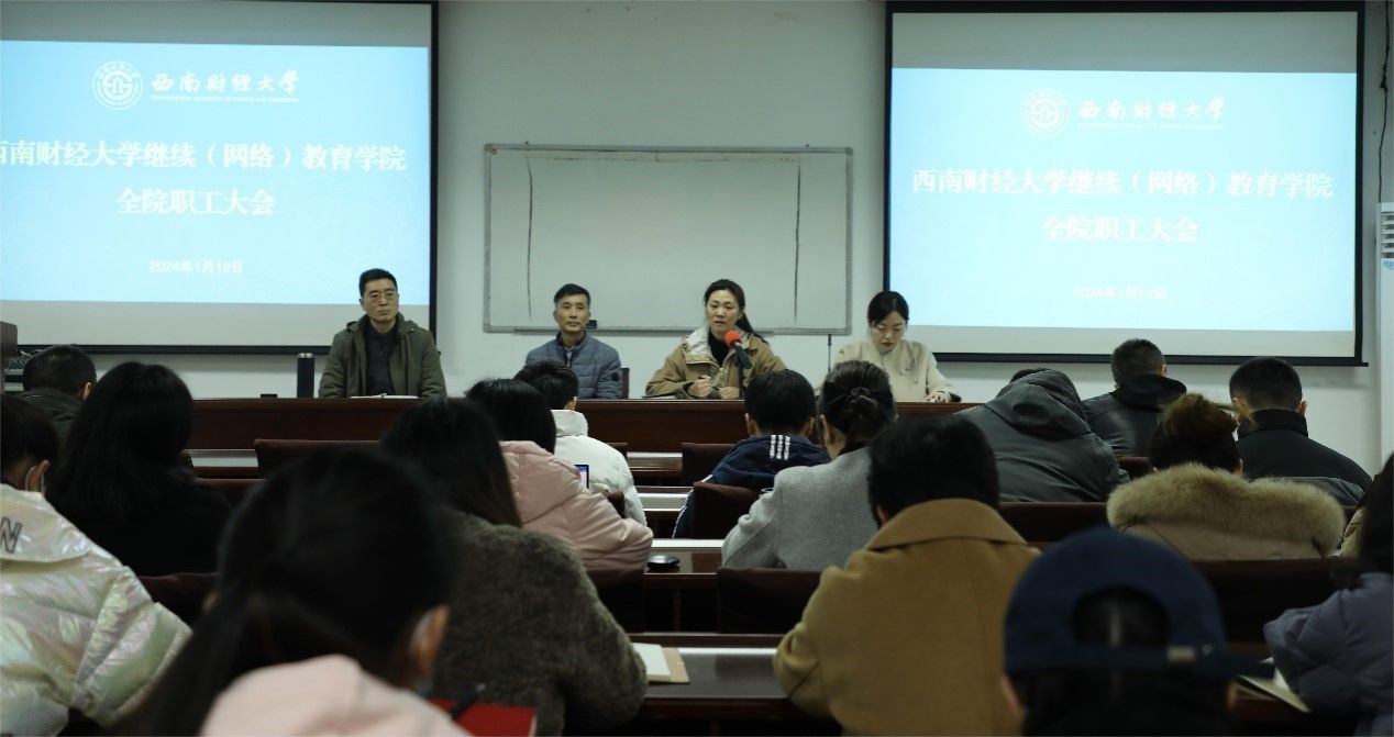 1月12日上午,继续(网络)教育学院在计算机楼106视频会议室召开全院职工大会,总结回顾2023年度各项工作,安排部署近期及下学期工作任务。院长曾朝夕主持会议,学院全体职工参加了大会。