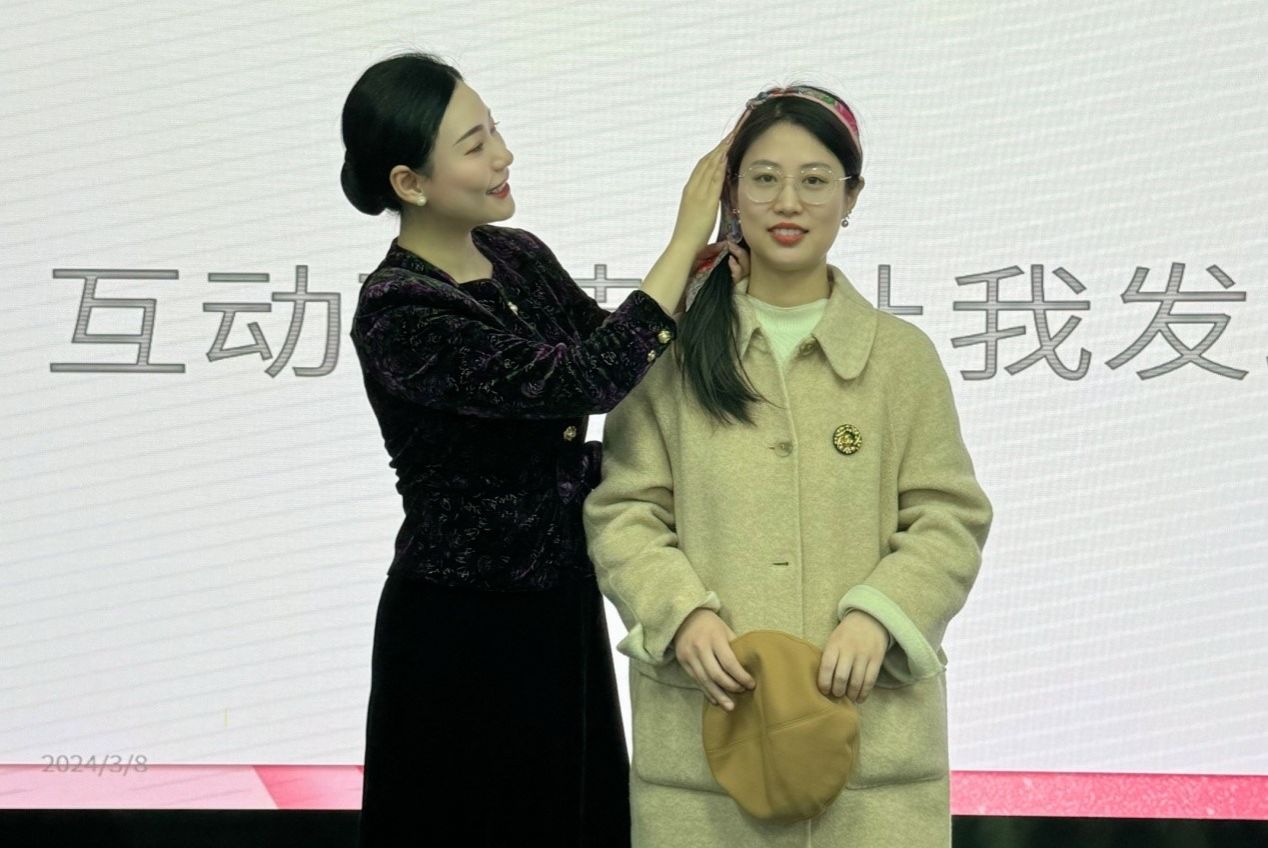 朱老师为“女神”们带来了一场精彩纷呈的形象管理知识讲座,通过丰富的图例,从仪容、仪表、仪态三个方面,详细为“女神”们分享了形象管理的基本理念、技巧和实用方法,以及日常妆容与服饰的搭配技巧等。在互动环节,十位“女神” 被朱老师邀请上台,自由组合成五组,然后根据自己对形象管理的理解进行服饰搭配。朱老师逐一进行点评,根据不同身材、肤色和气质类型,为“女神们”提供了个性化的穿搭建议,大家受益匪浅。