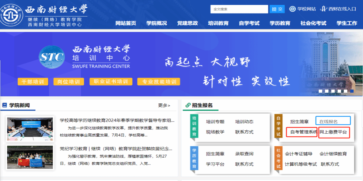 3. 自考管理平台、学生网上缴费平台 :7月16日9:00中断,7月16日12:00恢复访问,入口更换至官网首页右侧“自学考试”栏,见下图。